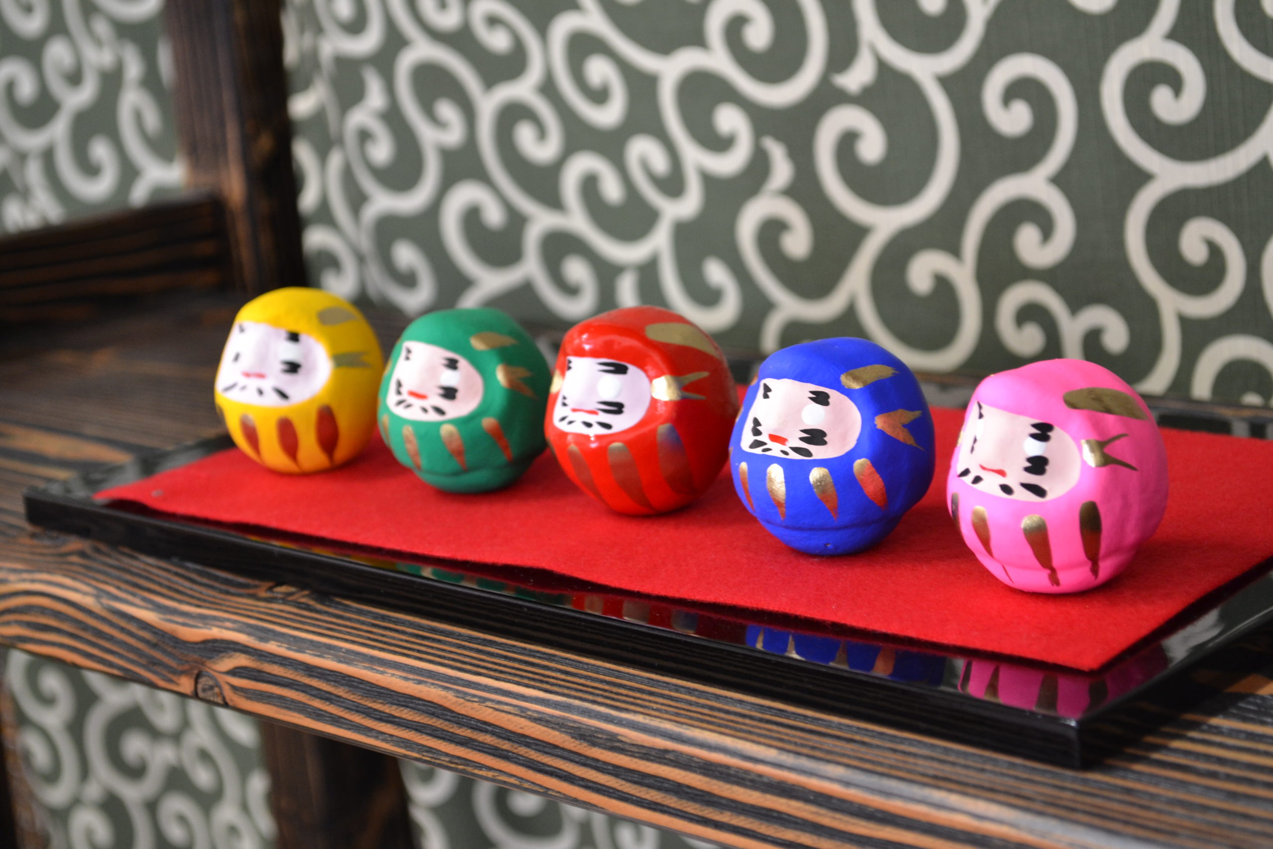 約300年の歴史を持ち、眉は鶴、口髭は亀、鬢は松と梅、顎髭は竹を表す。見るからに福々しくおめでたい縁起物。最近ではカラフルで可愛らしいだるまが人気